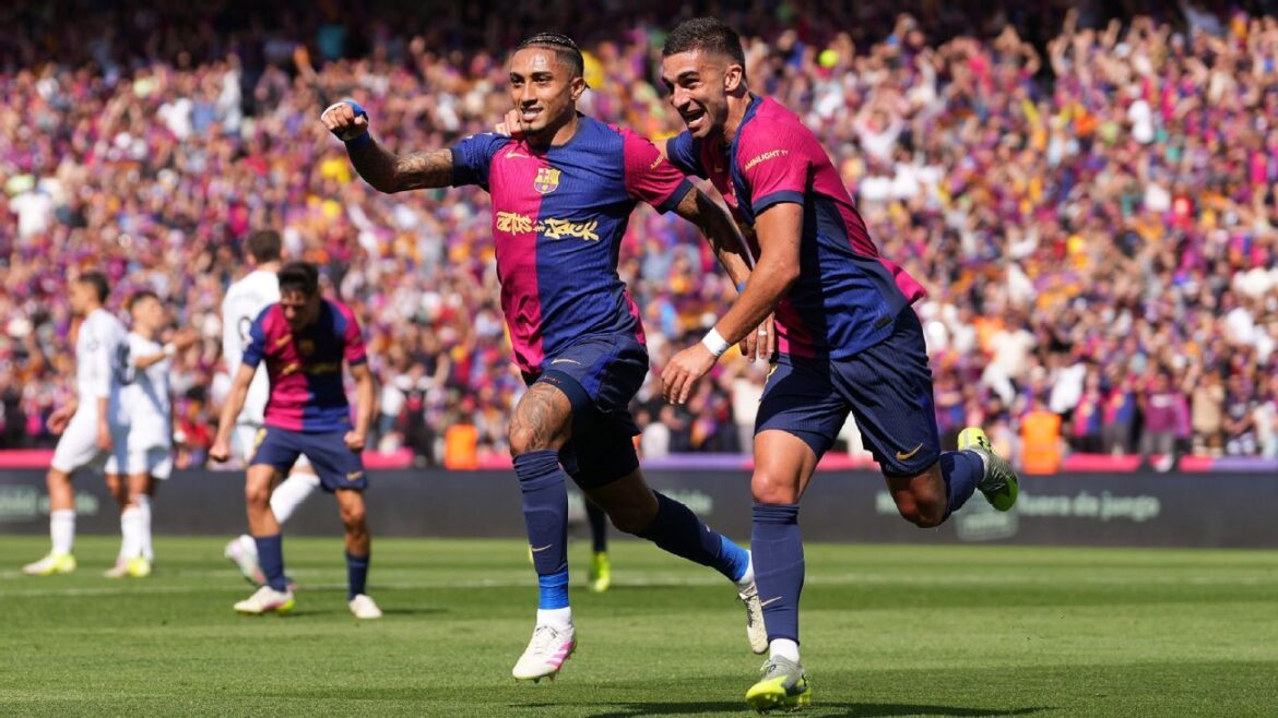 Kylian Mbappé put Madrid ahead from the penalty spot in the fifth minute and doubled the visitors’ lead shortly after to give Madrid hope of blowing the title race wide open at Montjuïc. But their joy was short-lived, as Eric García‘s header reduced the deficit, Lamine Yamal‘s curling shot made it 2-2 and Raphinha scored twice to see Barça go 4-2 up at halftime.