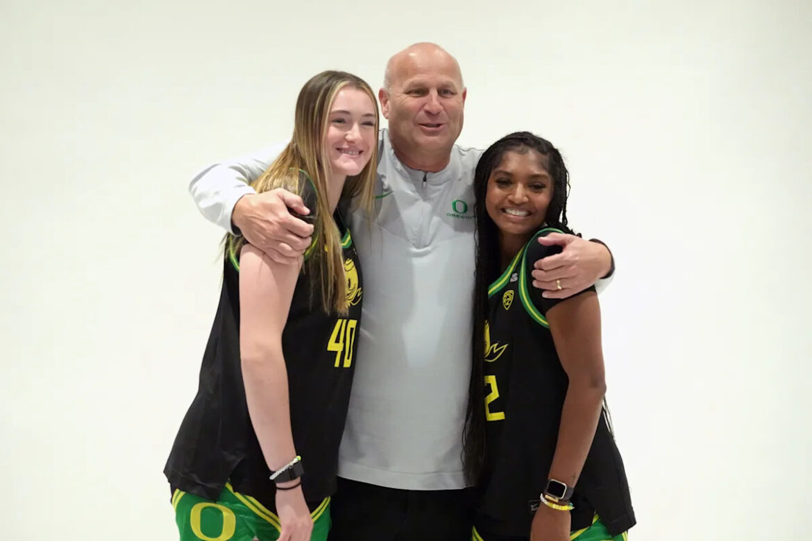 Oregon Ducks coach Kelly Graves (center) poses with forward Grace VanSlooten (40) and guard Chance Gray (2) during Pac-12 women’s basketball media day at Park MGM Las Vegas Conference Center on Oct. 10, 2023.