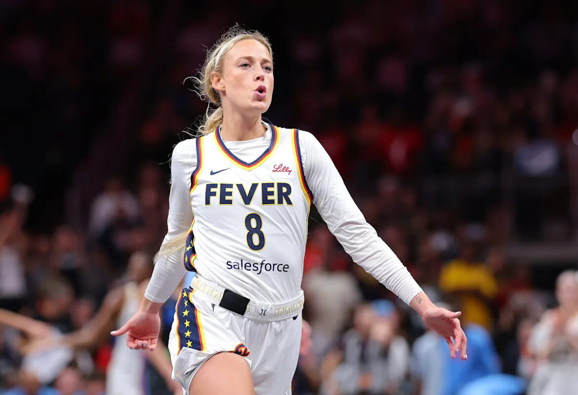 ATLANTA, GEORGIA – MAY 22: Sophie Cunningham #8 of the Indiana Fever reacts after their 81-76 win over the Atlanta Dream at State Farm Arena on May 22, 2025 in Atlanta, Georgia.