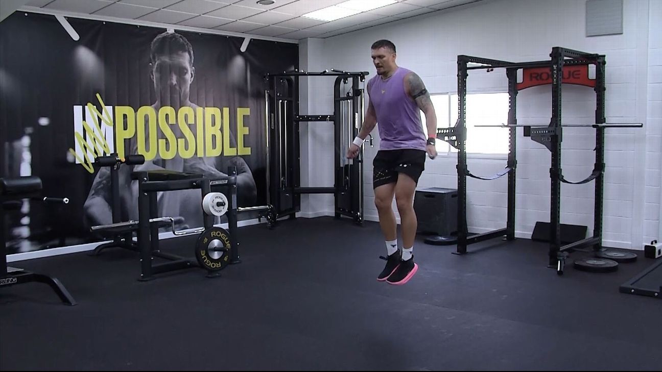 In the gym, the two Ukrainian boxers are going through the motions of what they regard as a “lighter” gym session of strength and power training, but it’s explosive. A fast-paced circuit of skipping, assault bike sprints, weights, kettlebell drills and body weight routines, as well as an excruciating exercise where Usyk performs a sit-up while throwing a giant medicine ball against the wall.
