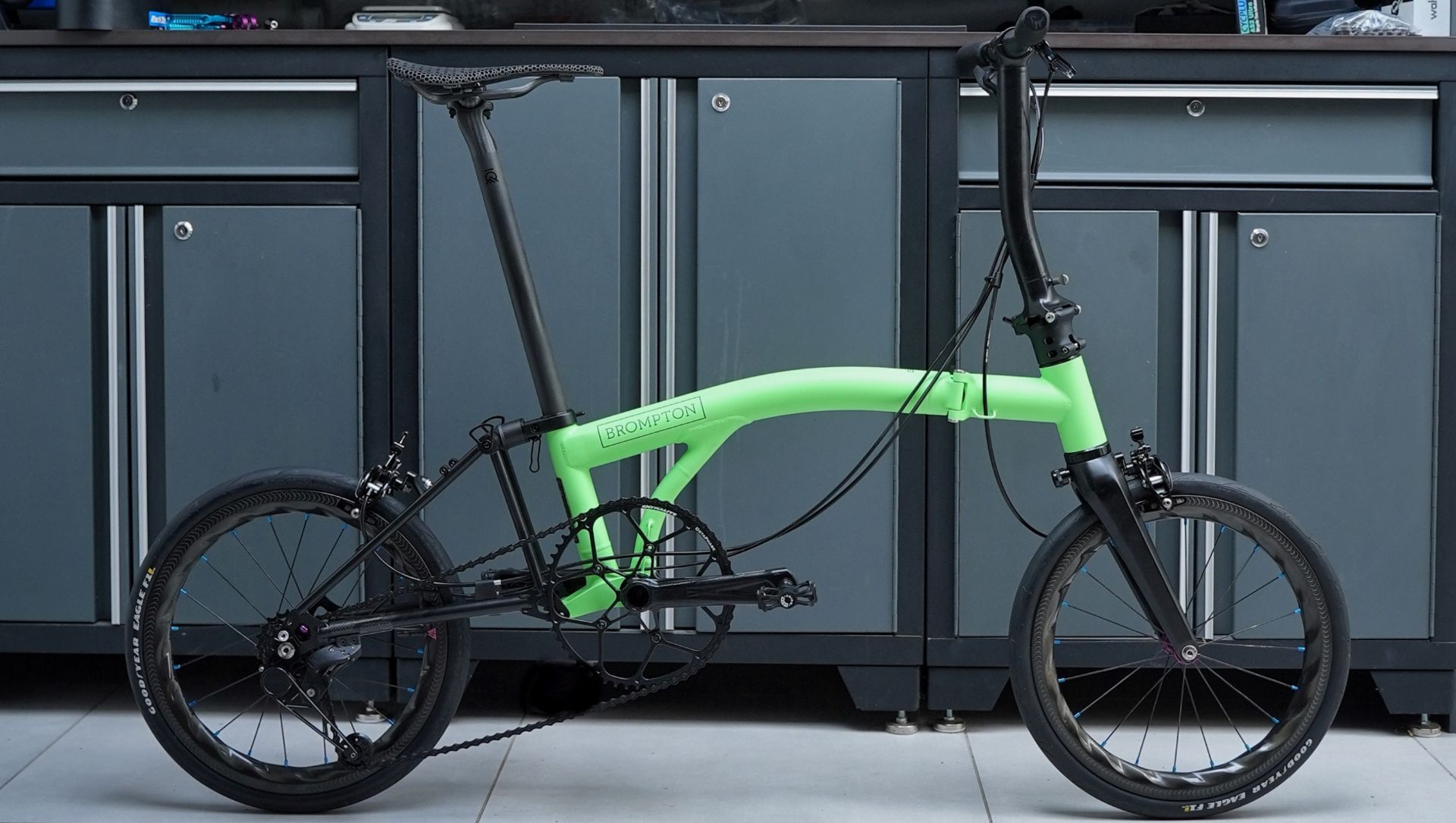 To achieve this frankly ridiculous number – the lightest stock T Line weighs just over 8kg – Ko replaced every part excluding the frame, fork and stem, ensuring that it still retains its foldable functionality; even here the hinge clamps have been replaced with custom 3D printed Ti versions while the frame has custom-cerakoted in a flouro green and black combination.